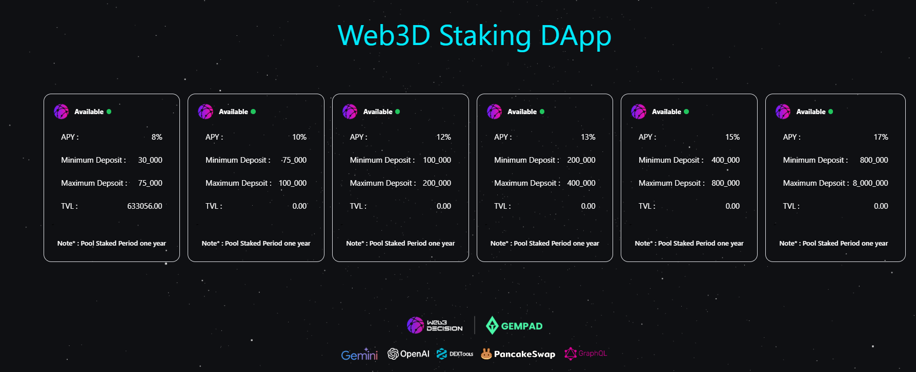 Staking and Revenue Sharing: Holders can stake Web3D tokens in different pools to earn attractive APYs and a share of platform service revenues.&#x20;